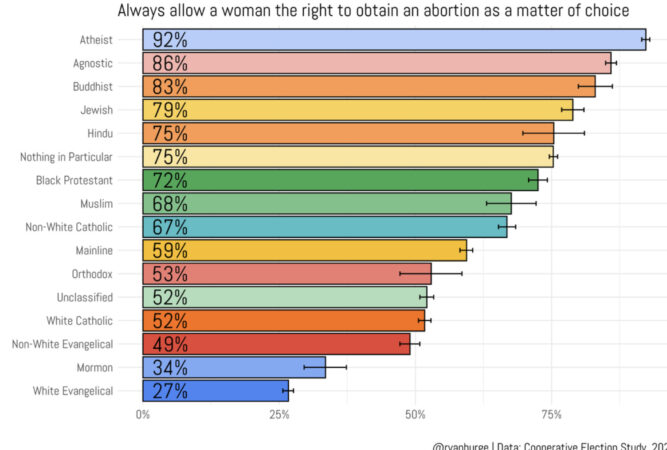 This chart below gives us an overview snapshot of how different religious demographic groups think about abortion. The bad news comes first. About a third of white evangelicals are pro-abort, which—as a matter of biblical principle—is outlandish and absurd. What kind of preaching are they sitting under? Almost a third of evangelicals are good with a woman being able to obtain an abortion as a matter of choice? That’s simply appalling, as in, really, really bad.
