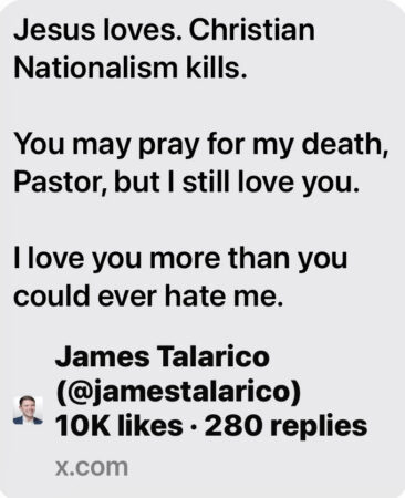 So of course the gotcha journalists who circulated the clip left out the parts that made this most evident and plain. They left out the part wishing that he would become “Talarico of Tarsus.” Using so of course for the second time in a row, so of courseThe Huffington Post went with the headline that “Pete Hegseth’s Pastor Says He Wants James Talacrico to Die.”