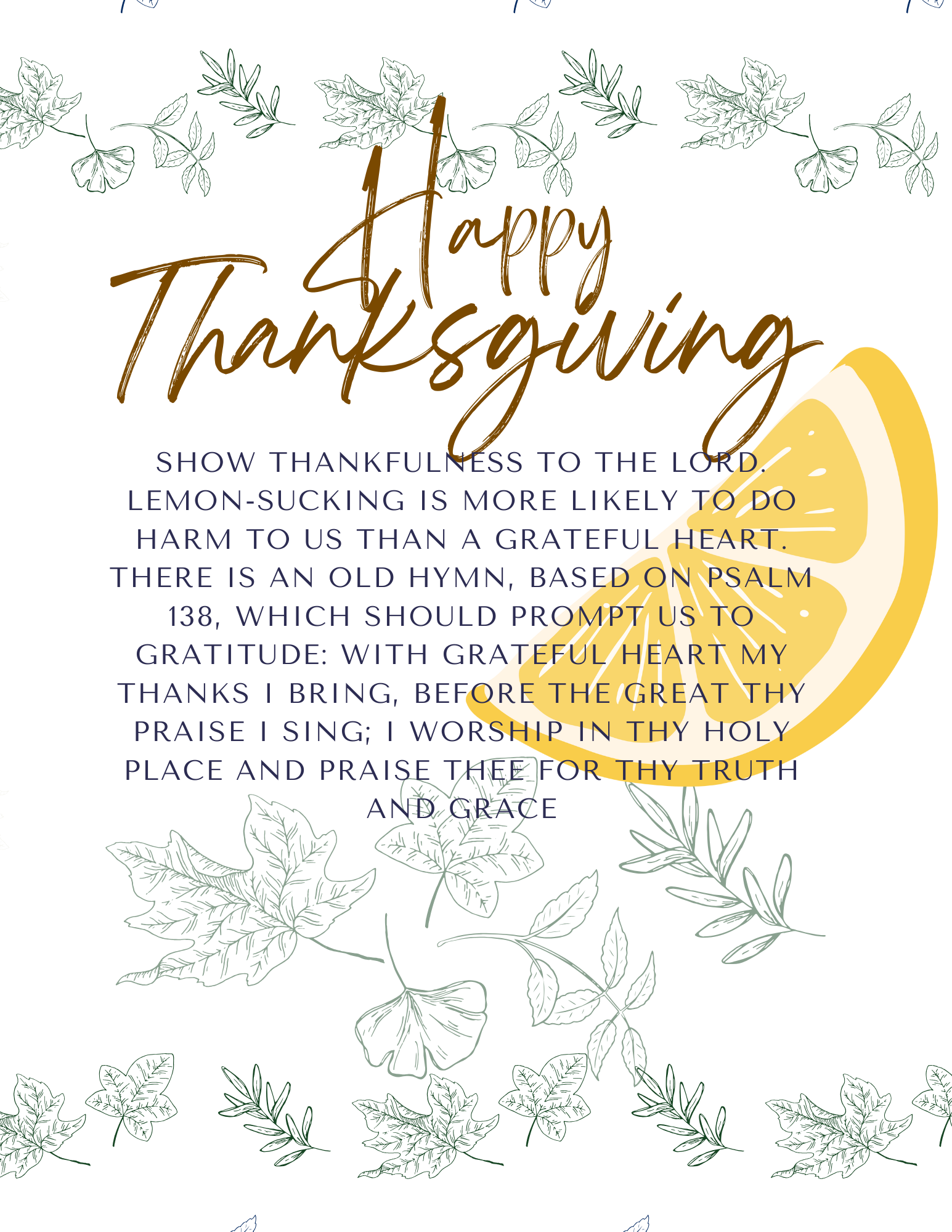 Thankful for new snow tires and good neighbours who care. Thankful that after many, many years I have found a Bible-believing, reformed church, even though it’s an hour away. Thankful that it may be possible for me to move there before another twelve months have passed and thereby also be closer to my daughters. Thankful for the knowledge that no matter what happens, our Father is in control and loves me. Happy Thanksgiving to all.